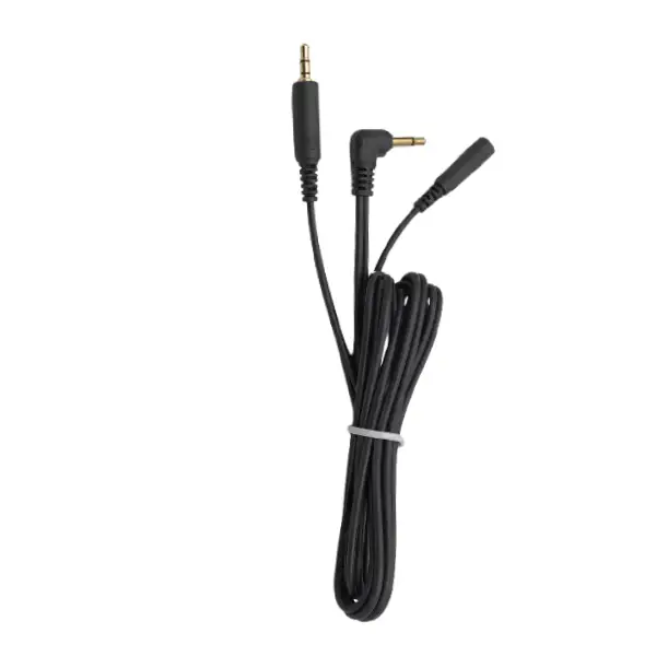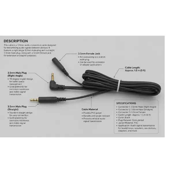 This cable is a 3.5mm audio connection cable designed for transmitting audio signals between devices. It features a right-angle 3.5mm male plug and a straight 3.5mm male plug, along with a 3.5mm female jack